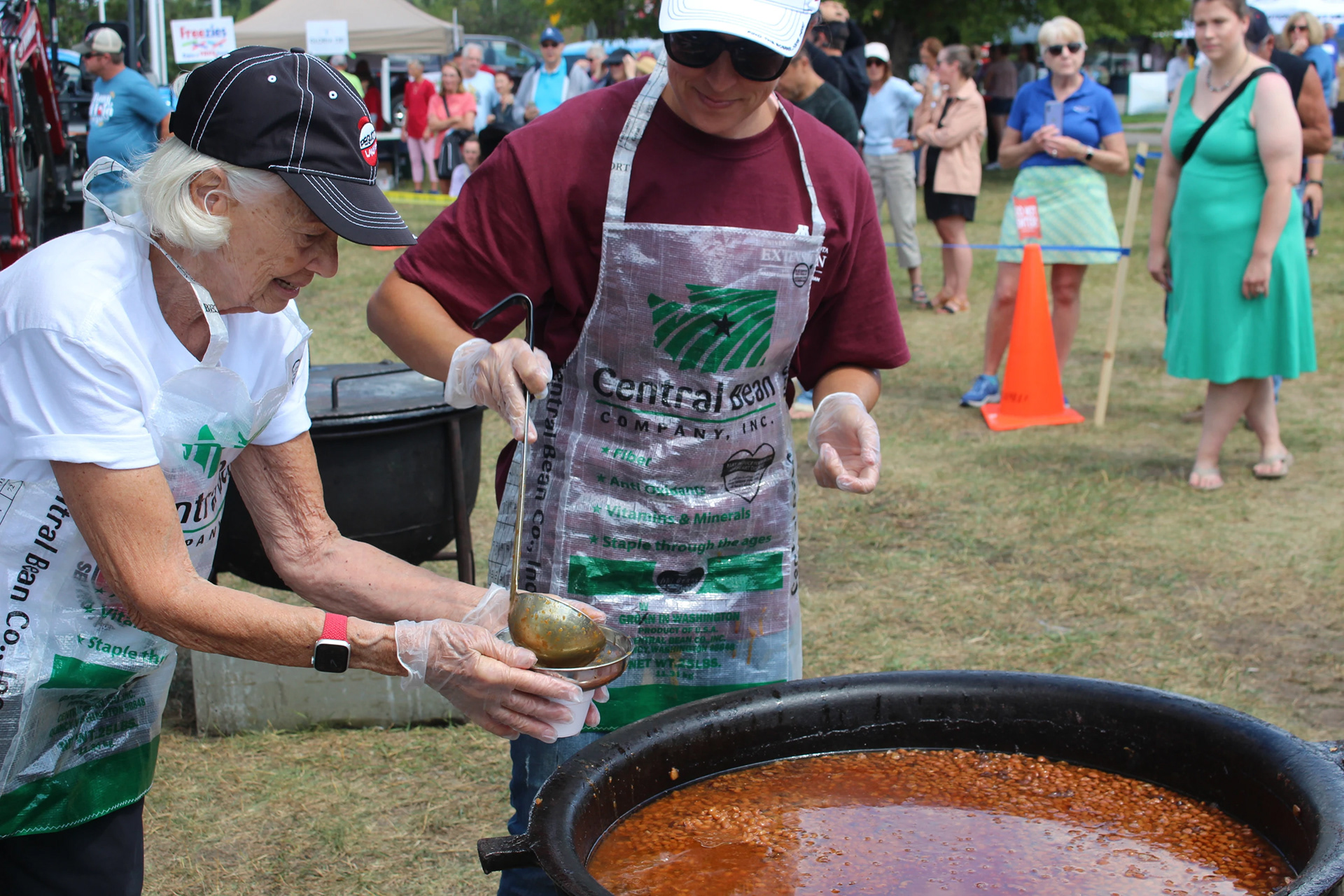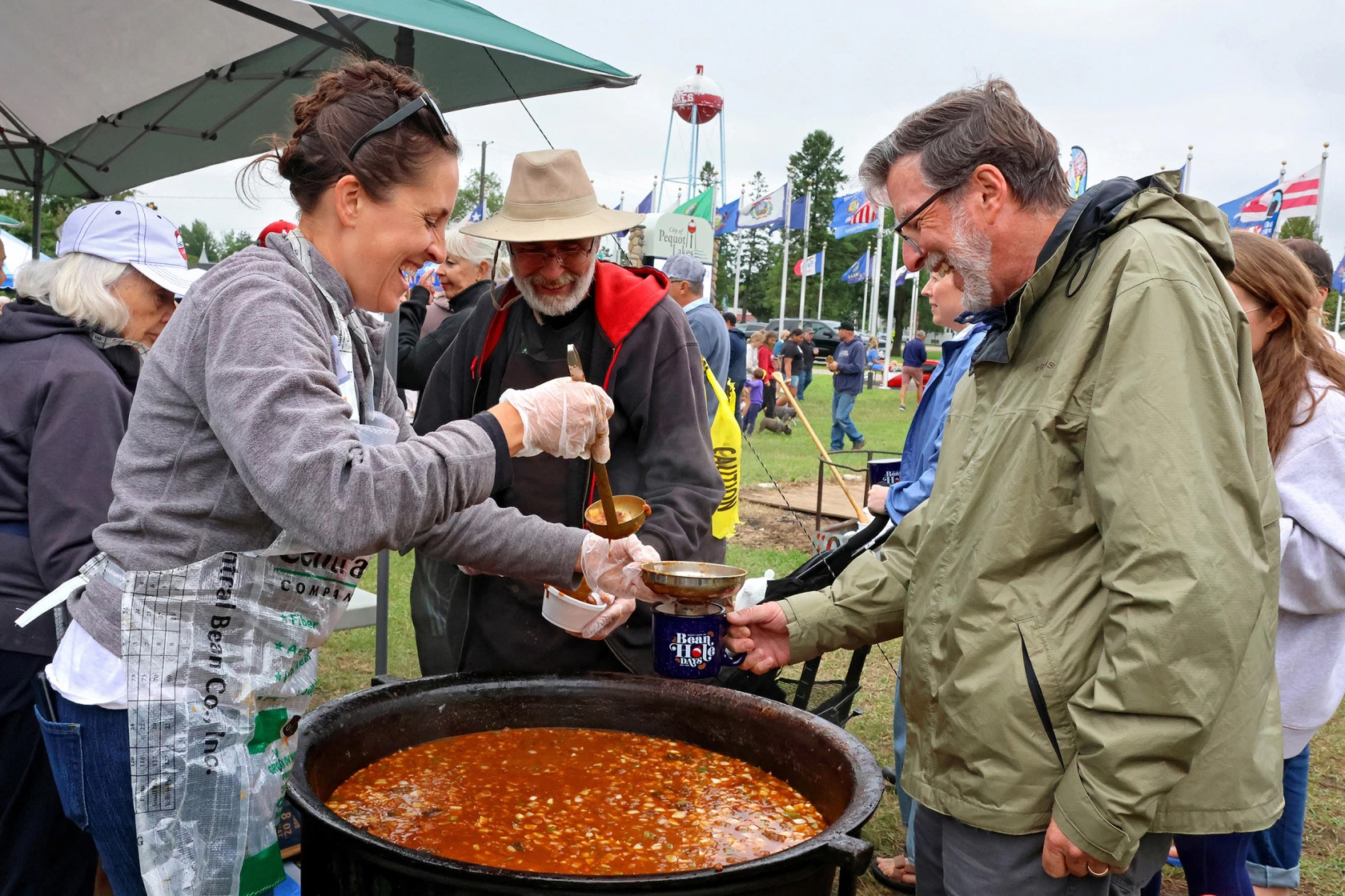 Nicky Hardy, left, and Rick Hansen serve up beans to Mike Cahill during Bean Hole Days on Wednesday, July 16, 2025, in Pequot Lakes. Kelly Humphrey / Brainerd Dispatch from "A rootin' tootin' good time in Pequot Lakes" in the Brainerd Dispatch; July 17, 2025